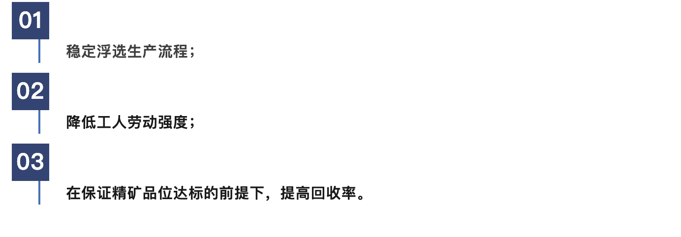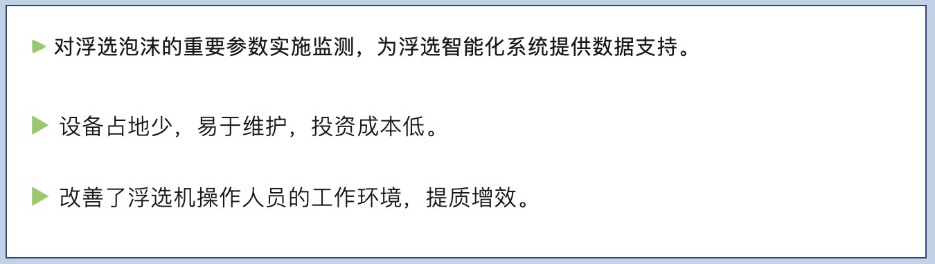 智能浮選全面解決方案,依托礦漿品位分析儀和泡沫分析儀等先進(jìn)的分析儀器,實(shí)現(xiàn)礦漿品位的在線檢測(cè)和泡沫性質(zhì)的實(shí)時(shí)量化;通過(guò)液位計(jì)、流量計(jì)、濃度計(jì)等儀表,實(shí)時(shí)監(jiān)測(cè)浮選機(jī)液位、礦漿流量、礦漿濃度和充氣量等關(guān)鍵數(shù)據(jù);通過(guò)加藥機(jī)、電控閥門(mén)、氣控閥門(mén)等執(zhí)行機(jī)構(gòu);配合先進(jìn)的控制邏輯和算法,實(shí)現(xiàn)加藥量、充氣量和浮選液位的智能調(diào)控,達(dá)到減少人工干預(yù),降低生產(chǎn)成本,穩(wěn)定精礦品位,提高精礦回收率的目的。
